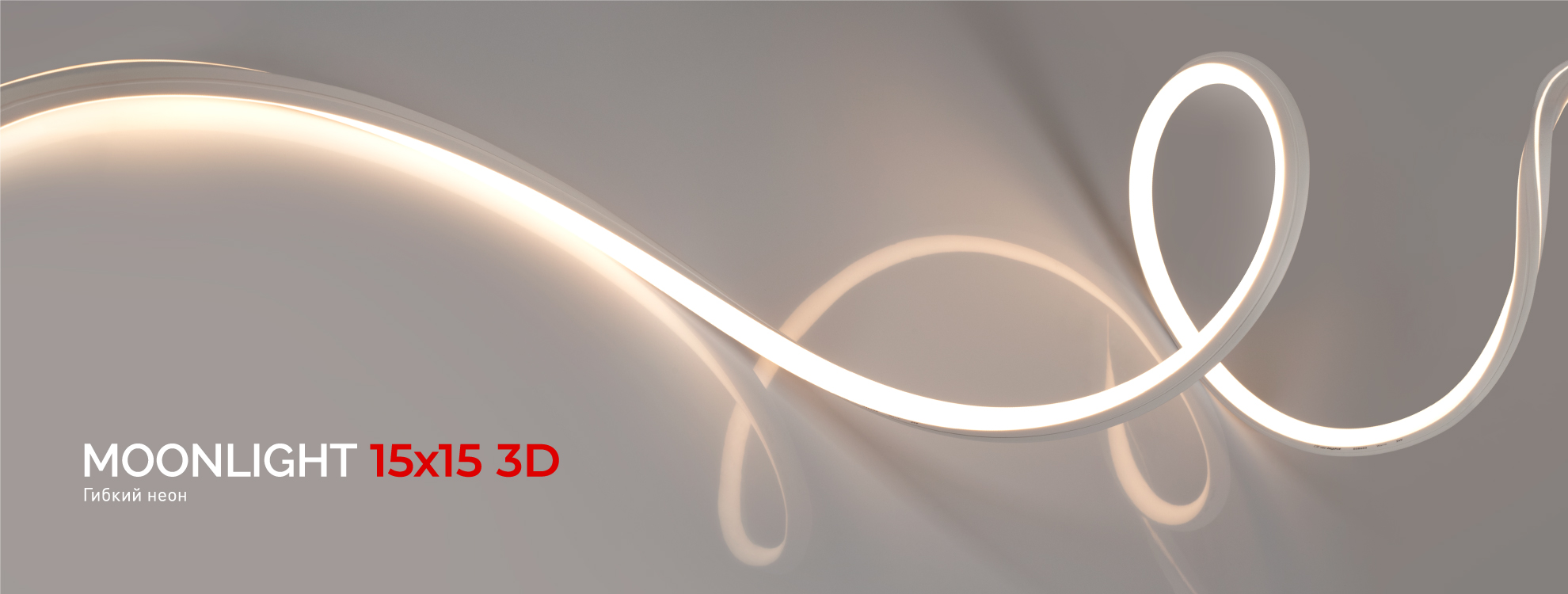 Гибкий неон MOONLIGHT с сечением 15×15 мм можно изгибать во все стороны, что позволяет создавать инсталляции различных форм и подсветку сложных элементов. За счет высокой степени пылевлагозащиты (IP67) гибкий неон отлично подойдет для создания уличной рекламы, декоративного и дополнительного освещения мостов и фасадов зданий.