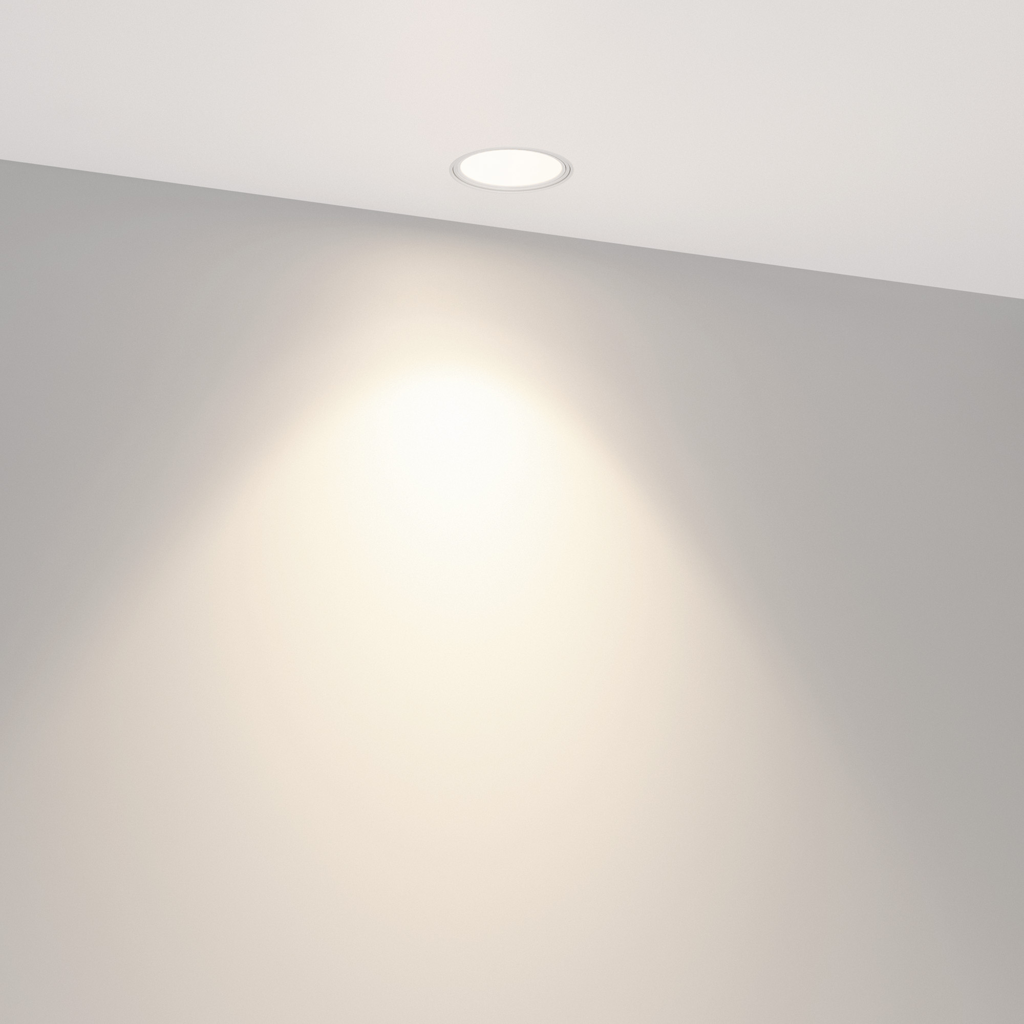Встраиваемый безрамочный светильник под шпаклевку мощностью 8.4 Вт. Предназначен для освещения жилых, офисных, торговых и других помещений. Дневной белый цвет свечения (4000 К) и световой поток 800 лм. Заглубленная оптика ограничивает боковое излучение, тем самым исключая появление ослепляющего эффекта. Высокий индекс цветопередачи (CRI>90) и узкий угол излучения 32° для локального освещения. Светильник встраивается в установочное отверстие диаметром 65 мм. Драйвер в комплекте для подключения к сети 230 В.