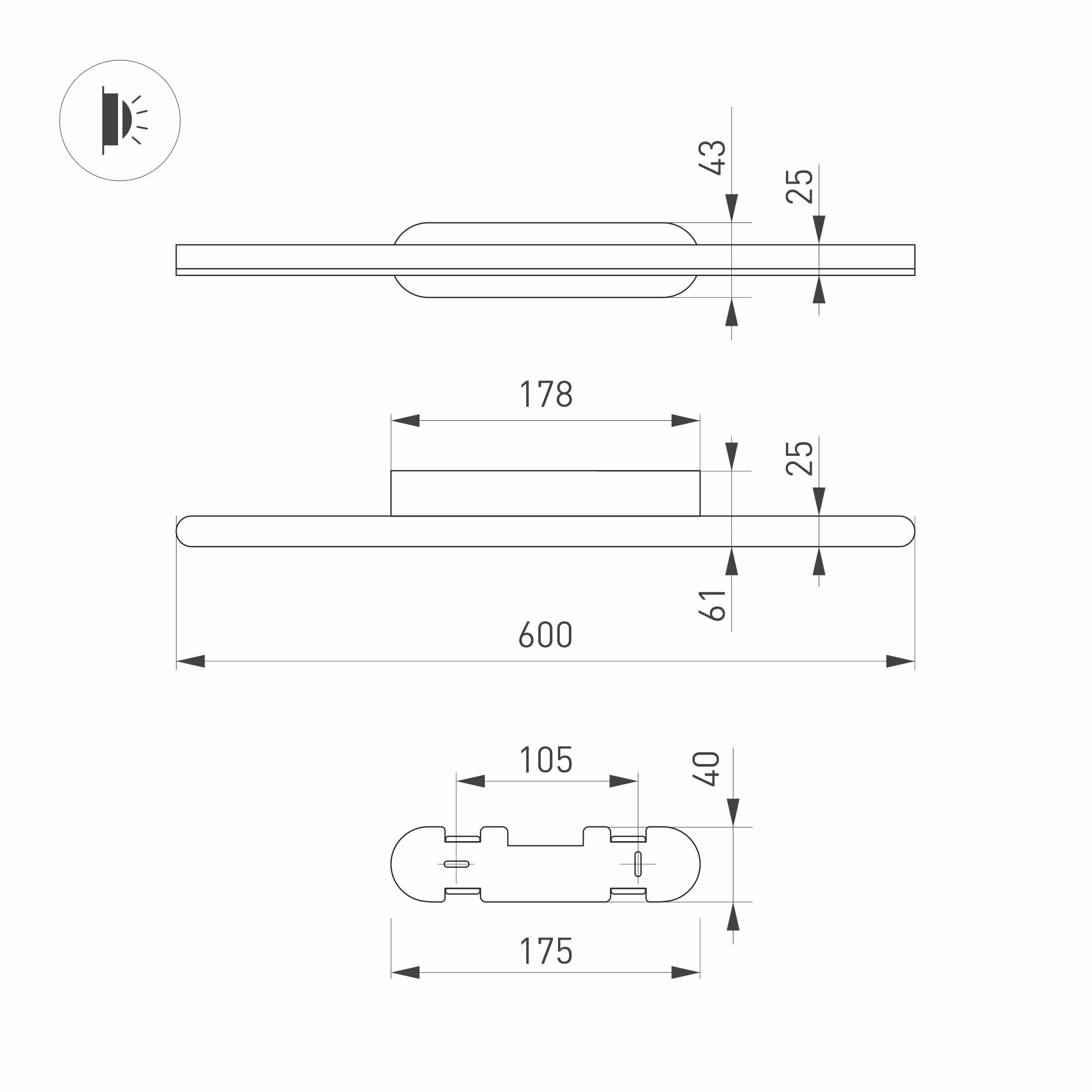 Декоративный настенный светильник. Мощность13 Вт, св. поток 600 лм, 50 лм/Вт, теплый 3000 K, CRI>90, угол 120°, напряжение питания 230 В. Черный фигурный корпус из алюминия, экран из матового поликарбоната, степень защиты IP54. Размер: длина 600 мм, ширина 60 мм, высота 42 мм. Размер светоизлучающего модуля: длина 600 мм, ширина 25 мм, высота 25 мм Монтаж накладной. Пульсация <0,5.