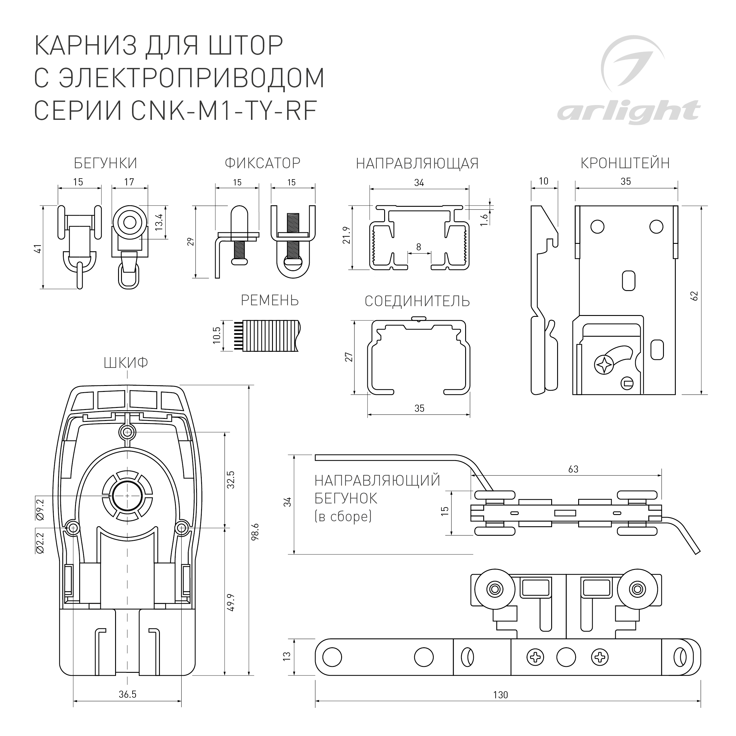 Комплект электрокарниза длиной до 2м (регулируется наборными частями) для раздвижных штор, состоящий из мотора, наборного алюминиевого трека, пульта и комплектующих. Электропривод с питанием 100-240В, мощность 45Вт, момент 1.2Нм, вес штор до 40кг. Управление с помощью пульта из комплекта, по WI-FI, 2.4ГГц, Bluetooth, "сухими" контактами на входе 4P4C. Совместим с платформой TUYA, АЛИСА от ЯНДЕКС. Управление со смартфона через приложение SmartLife, с помощью пульта в комплекте. Ремень из комплекта находится на дне коробки. 1 мотор, 1 пульт дистанционного управления, алюминиевый профиль 1,6 мм (1м - 1шт, 0.5м - 1шт, 0.2м - 2шт., 0.1м - 1 шт.), 2 соединителя 10 см, 1 соединитель 20 см, 1 переходник 5 см, 2 шкива, 2 пряжки ремня, 2 направляющих бегунка, ремень 4,4 м, 16 бегунков, 2 фиксатора, 4 кронштейна, 1 зажим на ремень