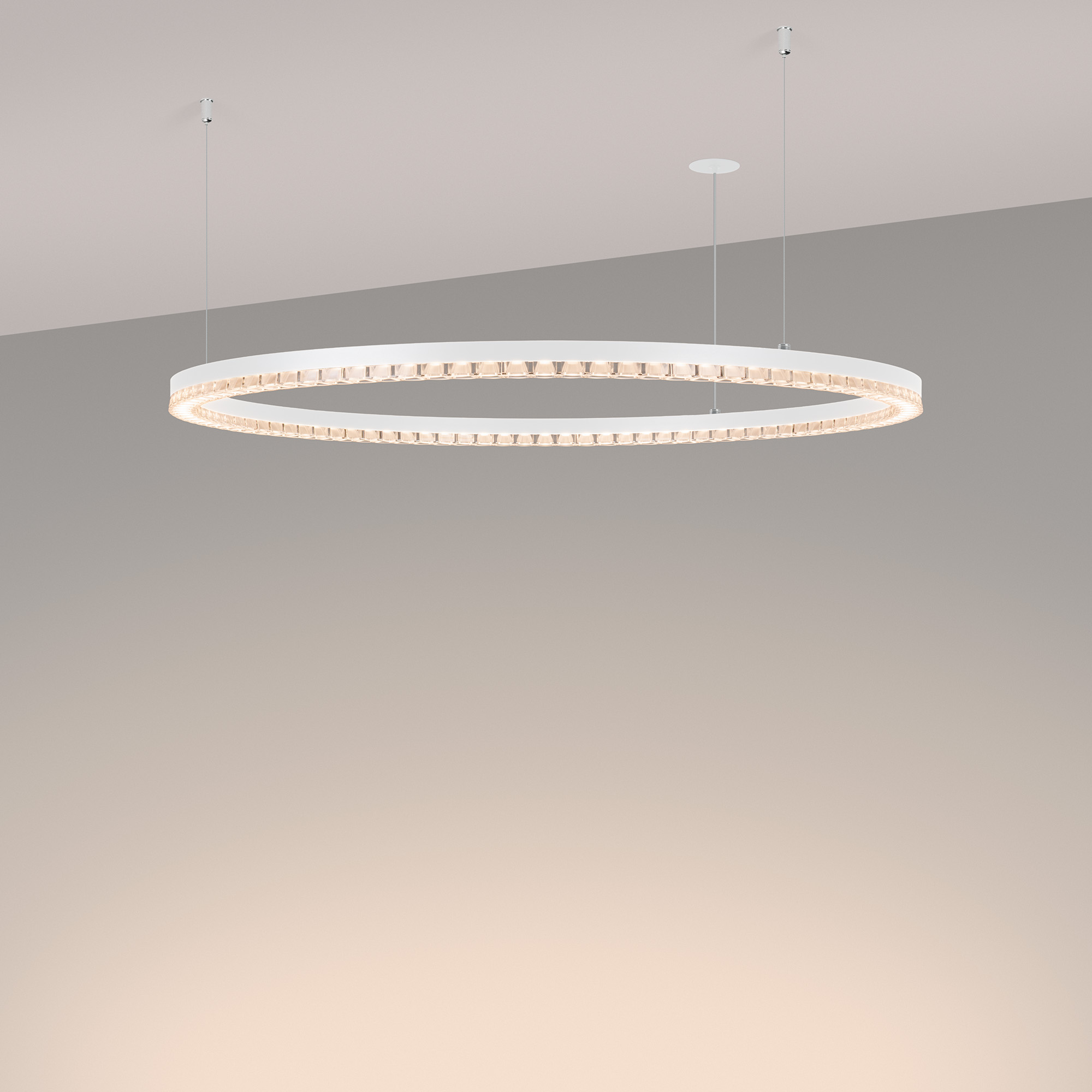 Под заказ. Подвесной светильник. Мощность 40 Вт, св. поток 3340 лм, 80-95 лм/Вт, теплый 3000 K, CRI>90, угол 45°, напряжение питания 230 В. Белый круглый корпус из алюминия, экран PMMA, степень защиты IP20. Размер: диаметр 850 мм, высота 34мм, ширина профиля 30 мм, размер чаши: диаметр 65 мм, высота 26 мм. Монтаж подвесной, длина подвеса 1200 мм, тип чаши встраиваемый, диаметр установочного отверстия чаши 60 мм. Драйвер 27-38 В, 1050 мА. Пульсация <0.3 %.