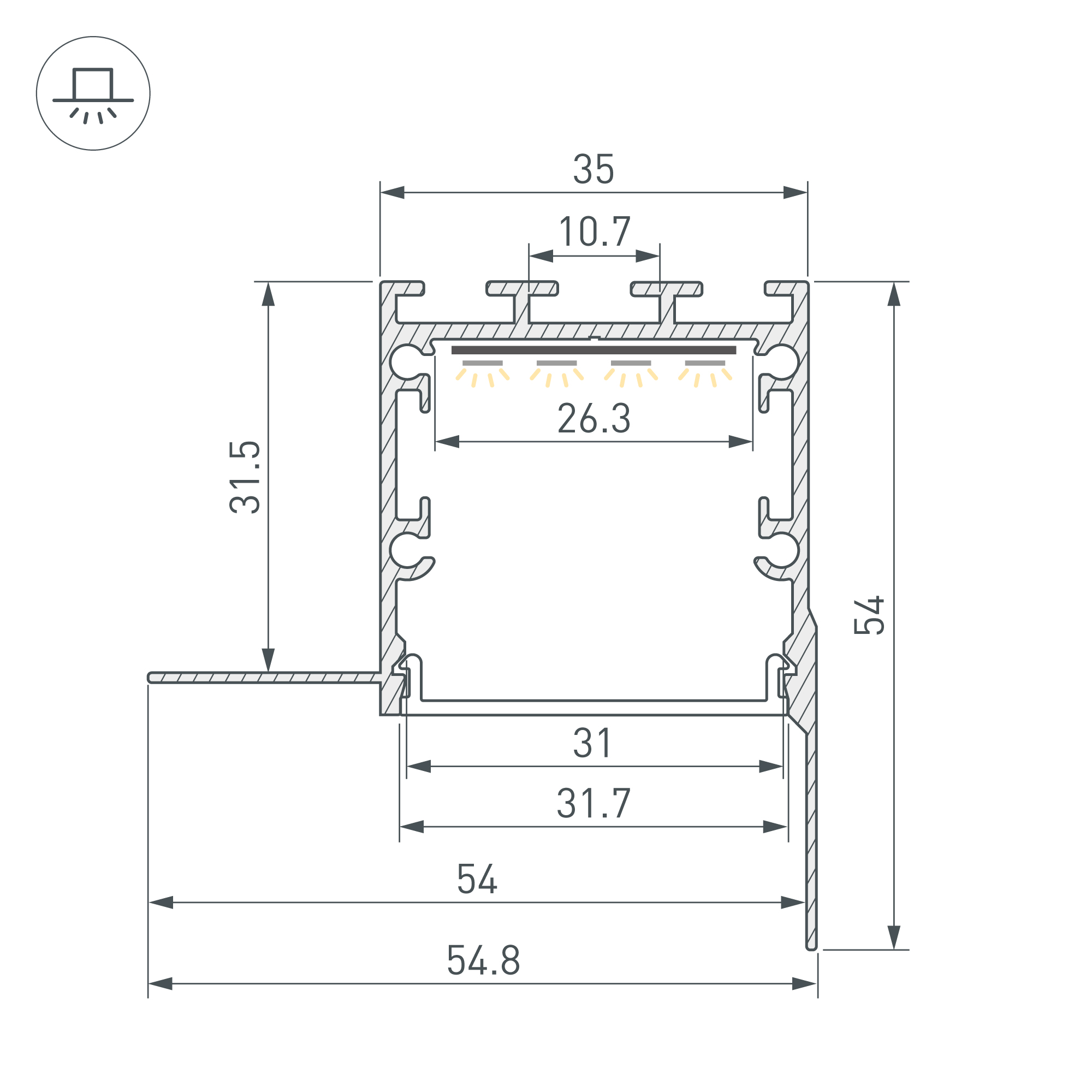 Встраиваемый профиль из анодированного алюминия со скрытым фланцем под строительную отделку устанавливается в потолки и потолочные ниши из гипсокартона для контурной подсветки помещений. Габаритные размеры профиля составляют 2000 мм в длину, 54,8 мм в ширину и 54 мм в высоту. Площадка для установки светодиодных лент позволяет использовать ленту шириной до 26 мм и мощностью до 46 Вт/м. Это обеспечивает гибкость в выборе светодиодных лент и создает потрясающие световые решения. Экраны, заглушки и другие аксессуары не включены в комплект и приобретаются отдельно. Цена указана за 1 метр профиля. Отличное решение для создания современных световых проектов.