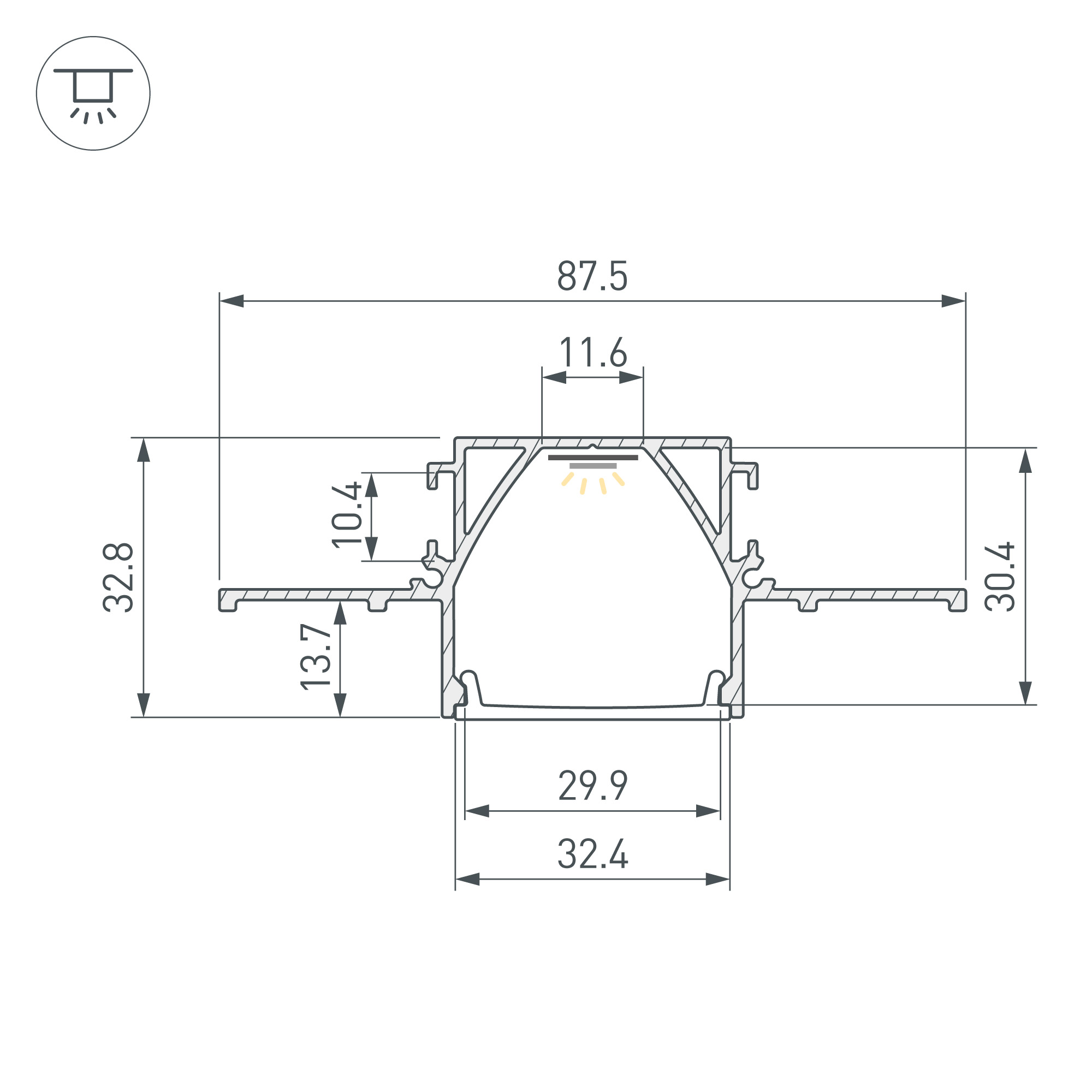 Встраиваемый профиль из анодированного алюминия со скрытым фланцем для установки в гипсокартон толщиной 12,5 мм для основной и контурной подсветки помещений. Габаритные размеры профиля составляют 2000 мм в длину, 87,5 мм в ширину и 32,8 мм в высоту. Площадка для установки светодиодных лент позволяет использовать ленту шириной до 11 мм и мощностью до 35,7 Вт/м. Это обеспечивает гибкость в выборе светодиодных лент и создает потрясающие световые решения.
