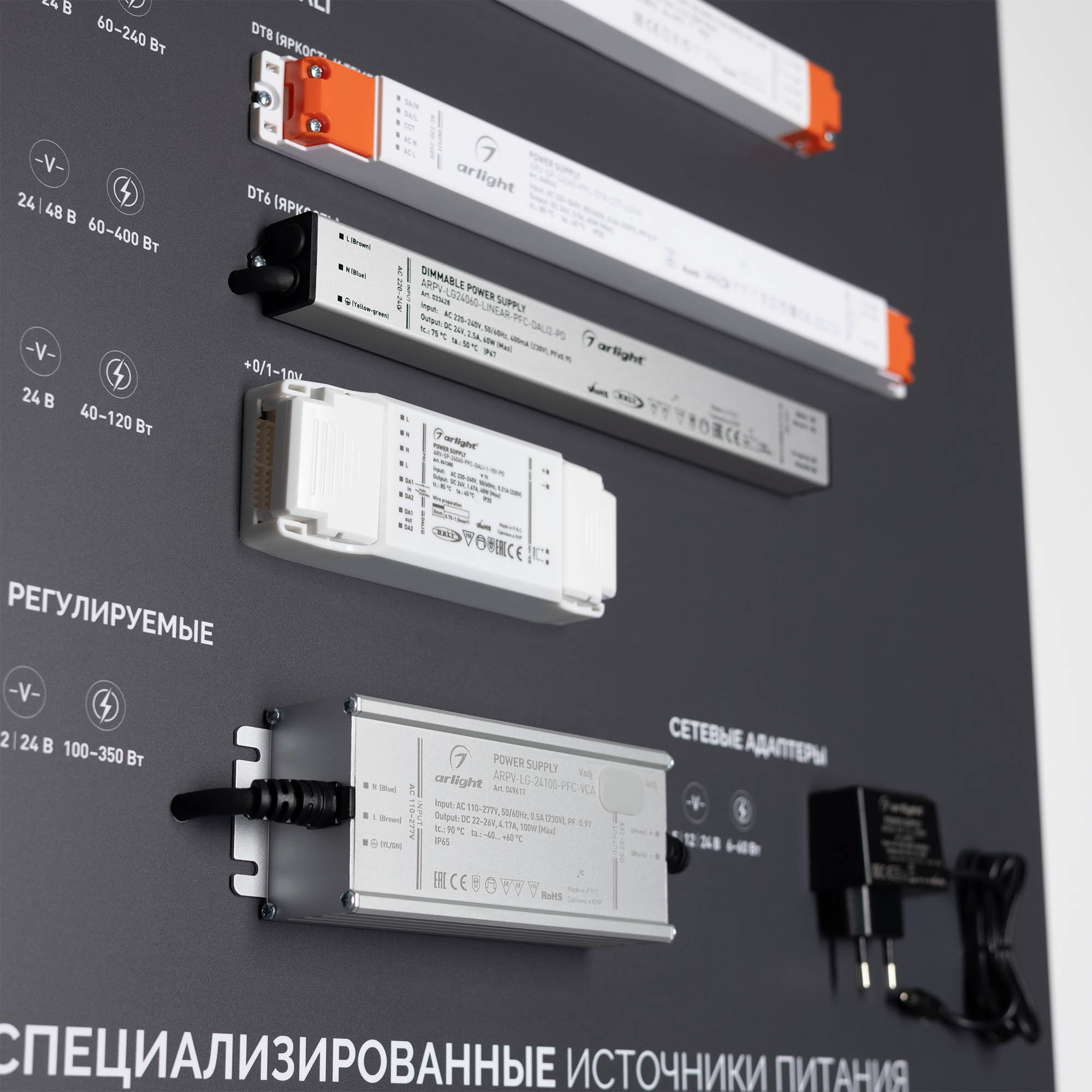 Представлен широкий ассортимент блоков питания Arlight для различных источников освещения: светодиодные ленты, светильники, мощные светодиоды и т. п. Показаны варианты встройки блоков питания в ниши и в профиль. Реализован механизм плавного включения светодиодной ленты. Материал корпуса стенда - алюкобонд 3 мм, пленка, печать.