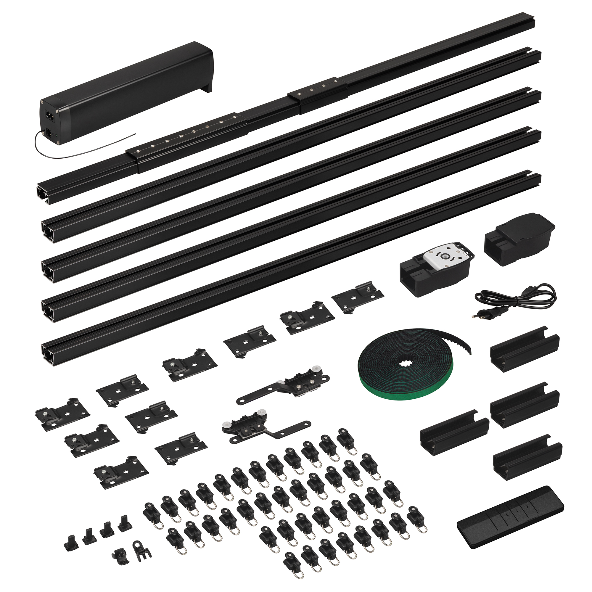 1 мотор, 1 пульт дистанционного управления, алюминиевый профиль 1,6 мм (1м - 4шт, 0.5м - 1шт, 0.2м - 2шт., 0.1м - 1 шт.), 4 соединителя 10 см, 1 соединитель 20 см, 1 переходник 5 см, 2 шкива, 2 пряжки ремня, 2 направляющих бегунка, ремень 10,4 м, 24 бегунка, 2 фиксатора, 10 кронштейнов, 1 зажим на ремень
