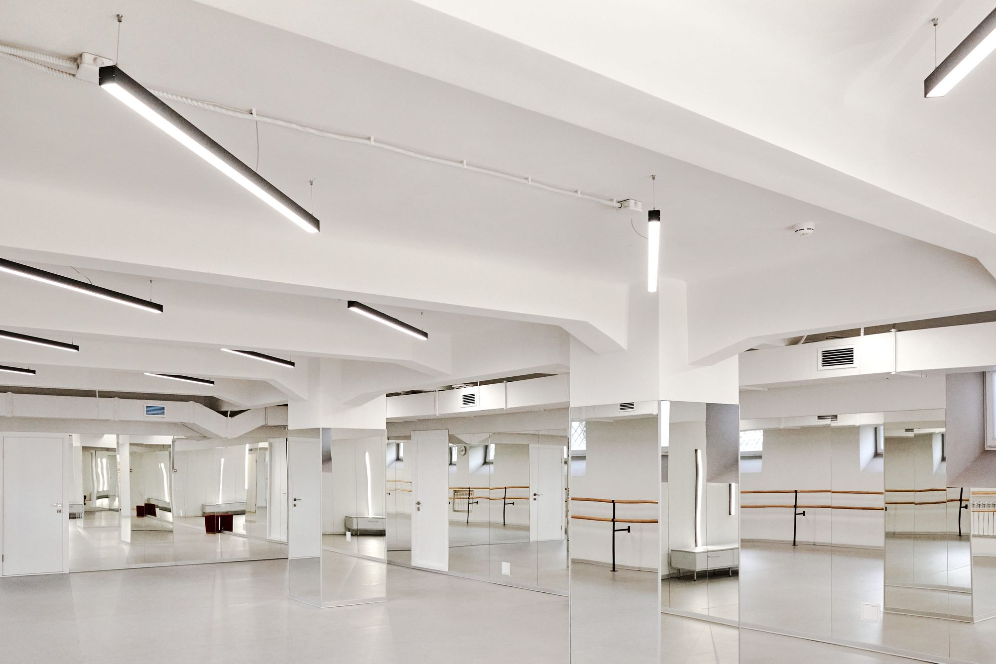 Одно из самых важных в танцевальной студии — свет, который не слепит и не мешает во время движения. Подвесные линейные светильники в черном цвете оборудованы опаловым экраном SL W45 3000 OPAL, который образует мягкое комфортное свечение.