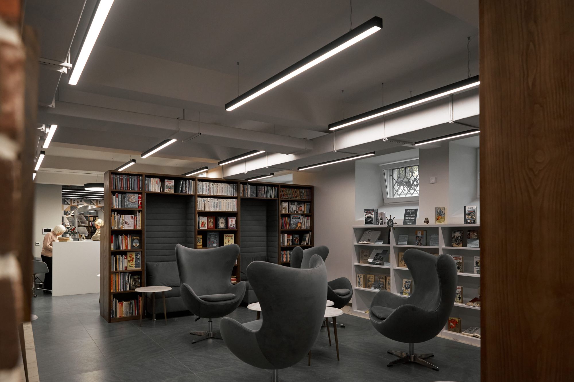 Чтобы «уравновесить» потолочные перекрытия, для освещения библиотеки были выбраны подвесные светильники. Линии света на основе профиля SL LINE на подвесе в стильном черном цвете образуют строгую геометрию. Круглые светильники TOR PILL PRISM своей формой вносят забавные нотки, напоминая, что это пространство для детей.