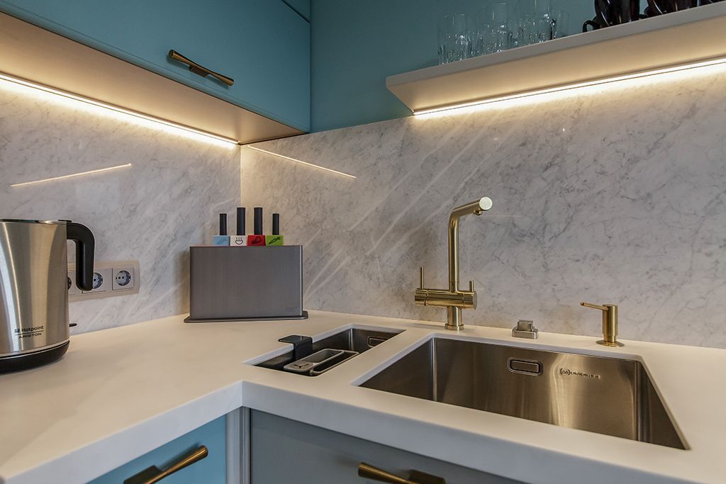 При подсветке рабочей зоны необходимо было создать яркое и, одновременно, мягкое освещение. Кроме того, минимальное количество шкафов и полок над рабочей поверхностью требовали максимально незаметных светильников.