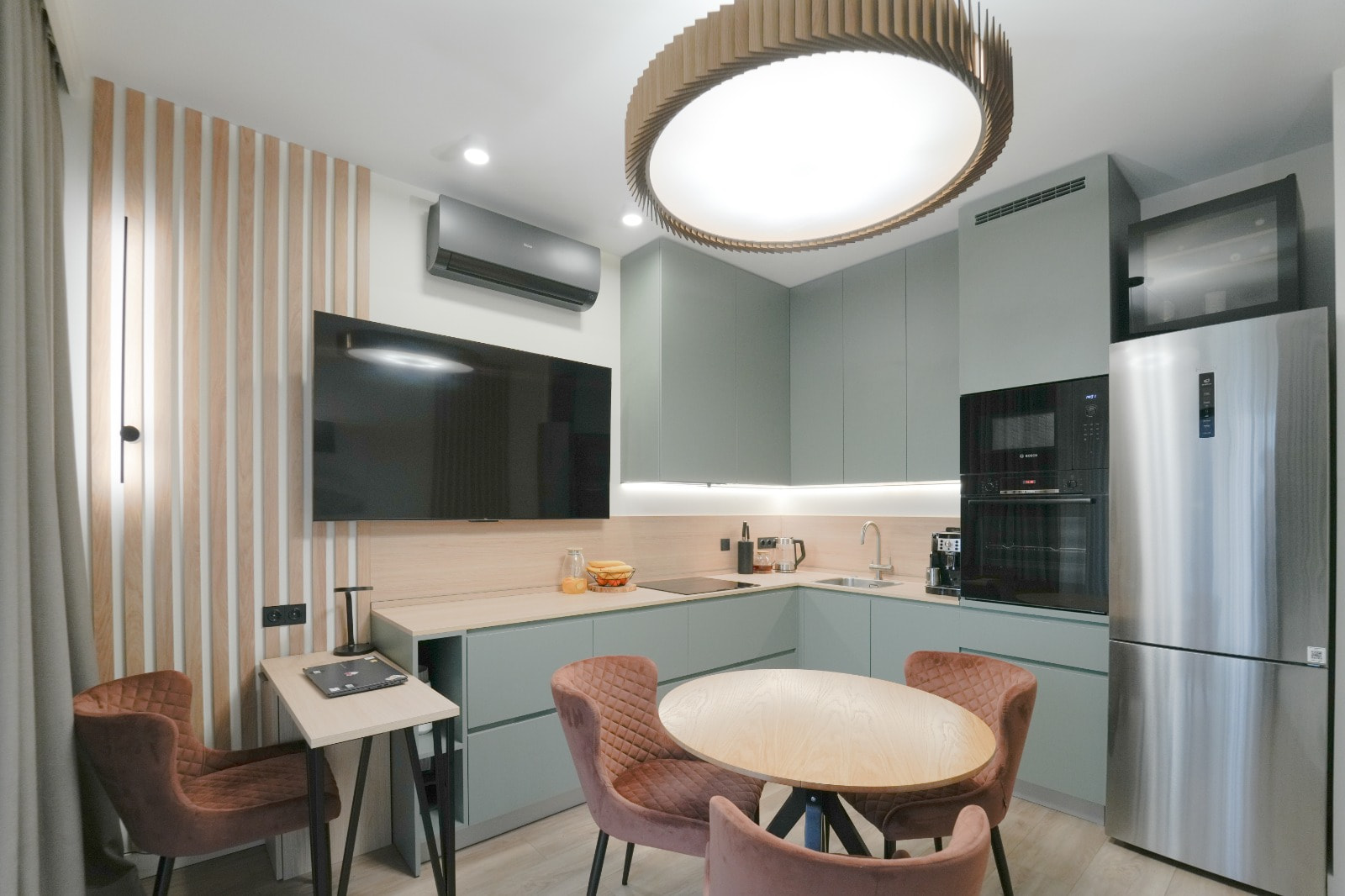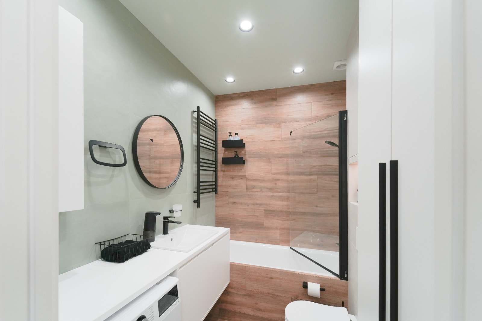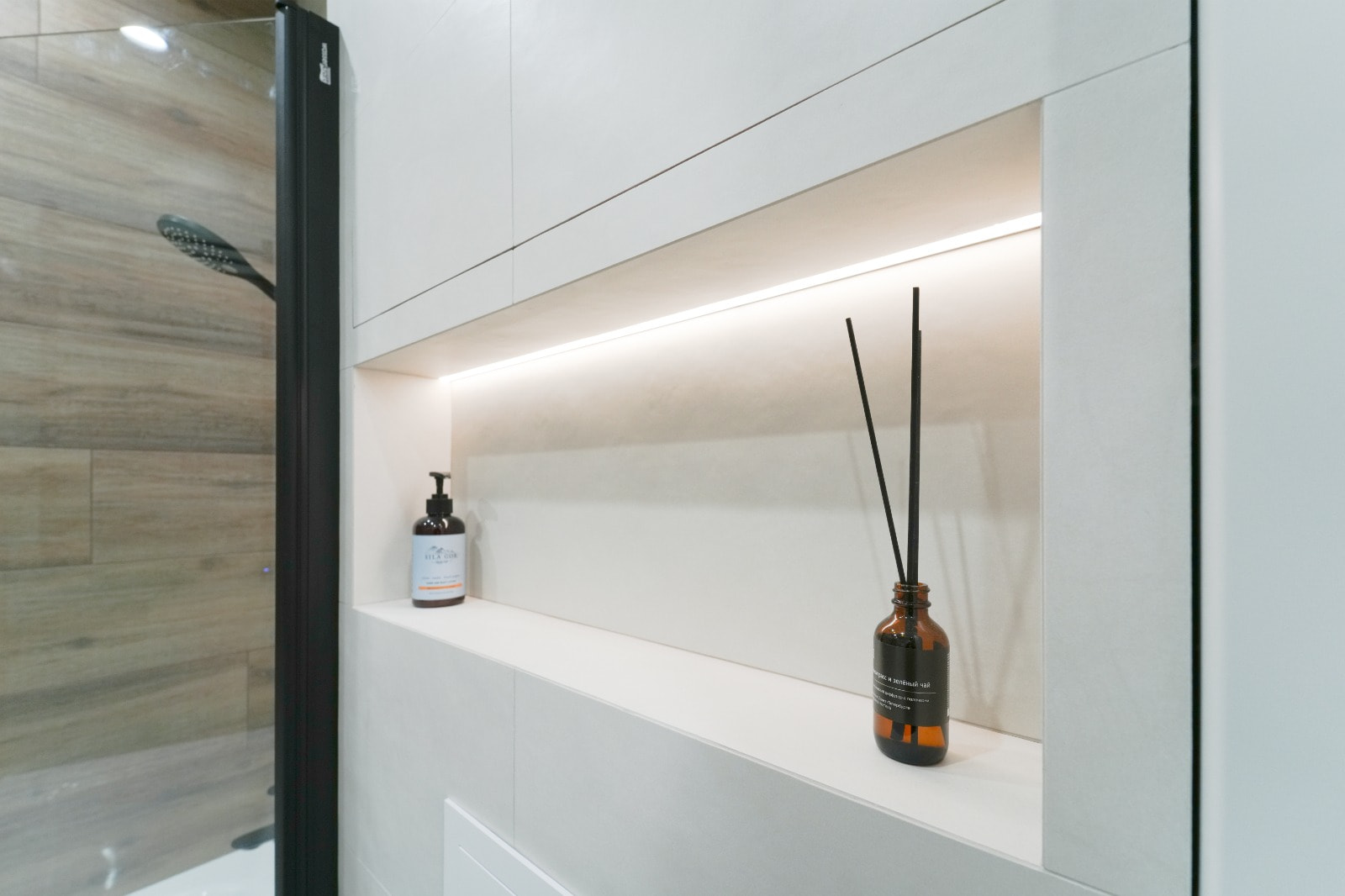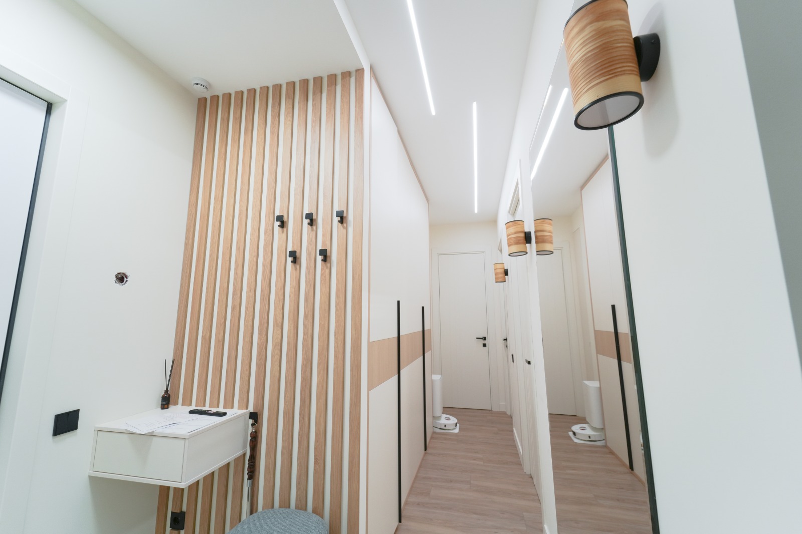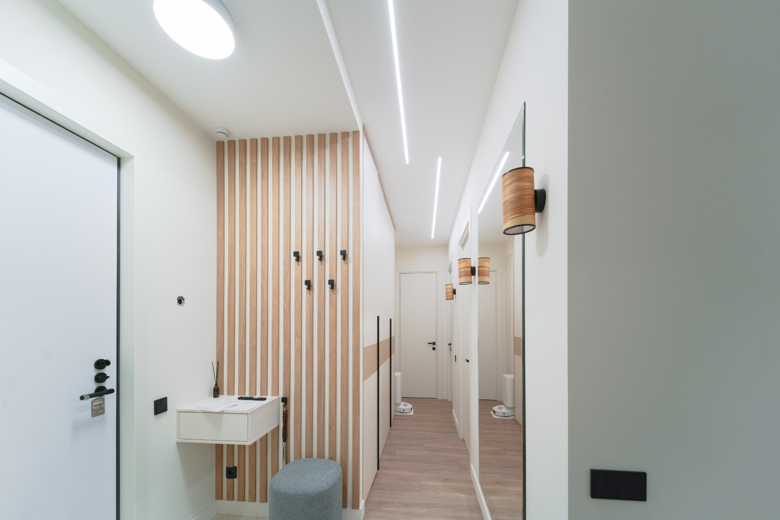 Основное освещение организовано встраиваемыми световыми линиями на основе светодиодной ленты — популярное решение для небольших пространств, которое сочетает в себе полноценное освещение и минимализм во внешнем исполнении.