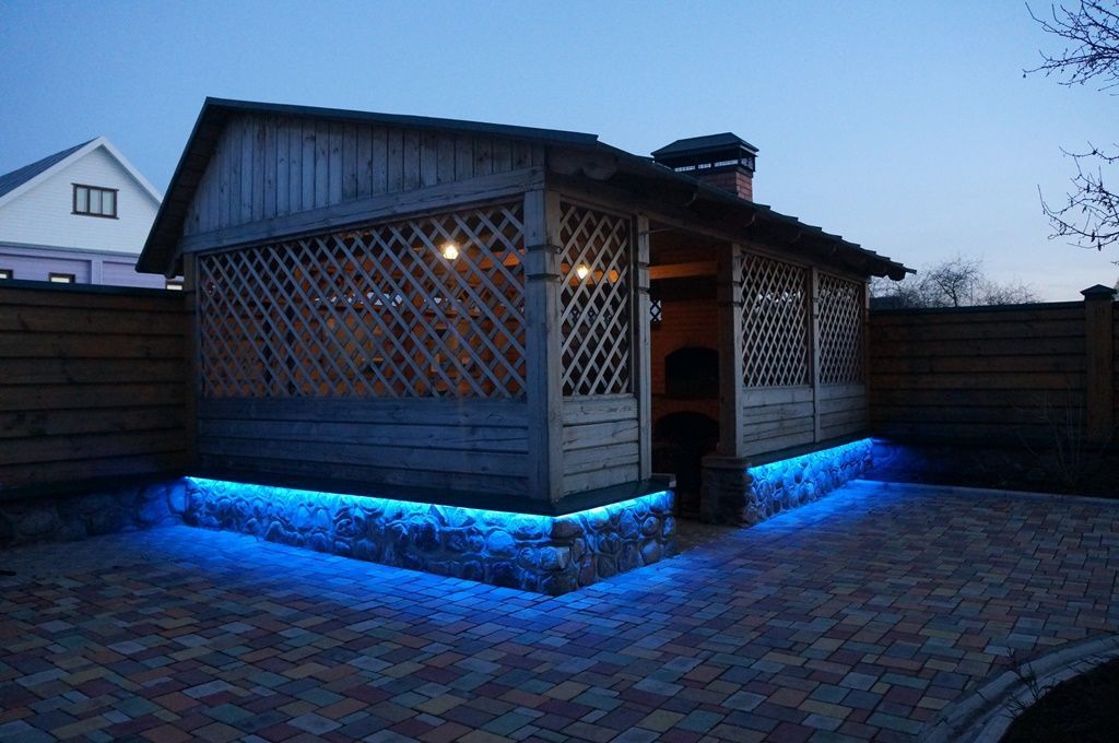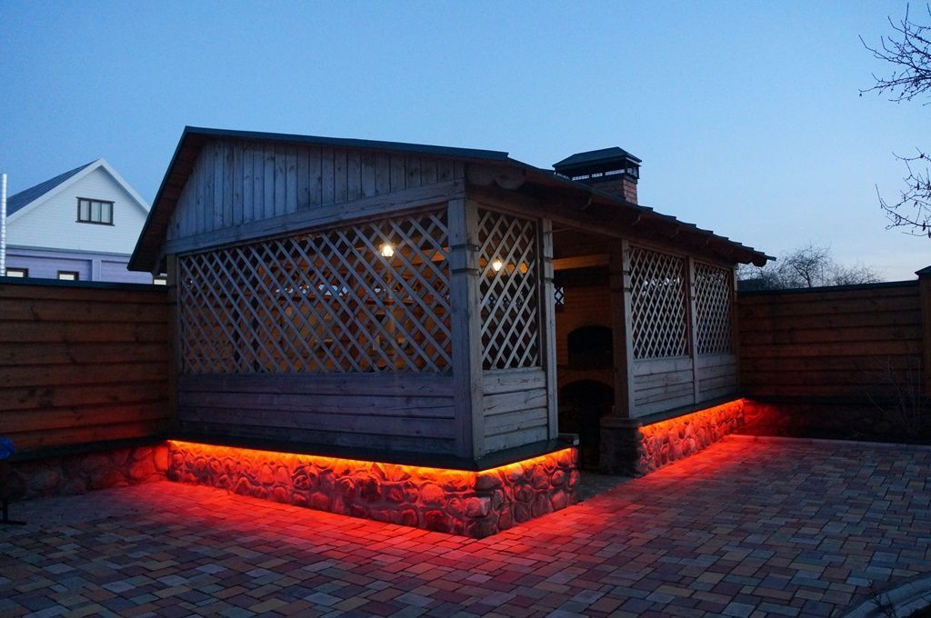 Простая подсветка фасада многоцветной светодиодной лентой RGB от компании arlight® в разы улучшила вид простой загородной беседки.
