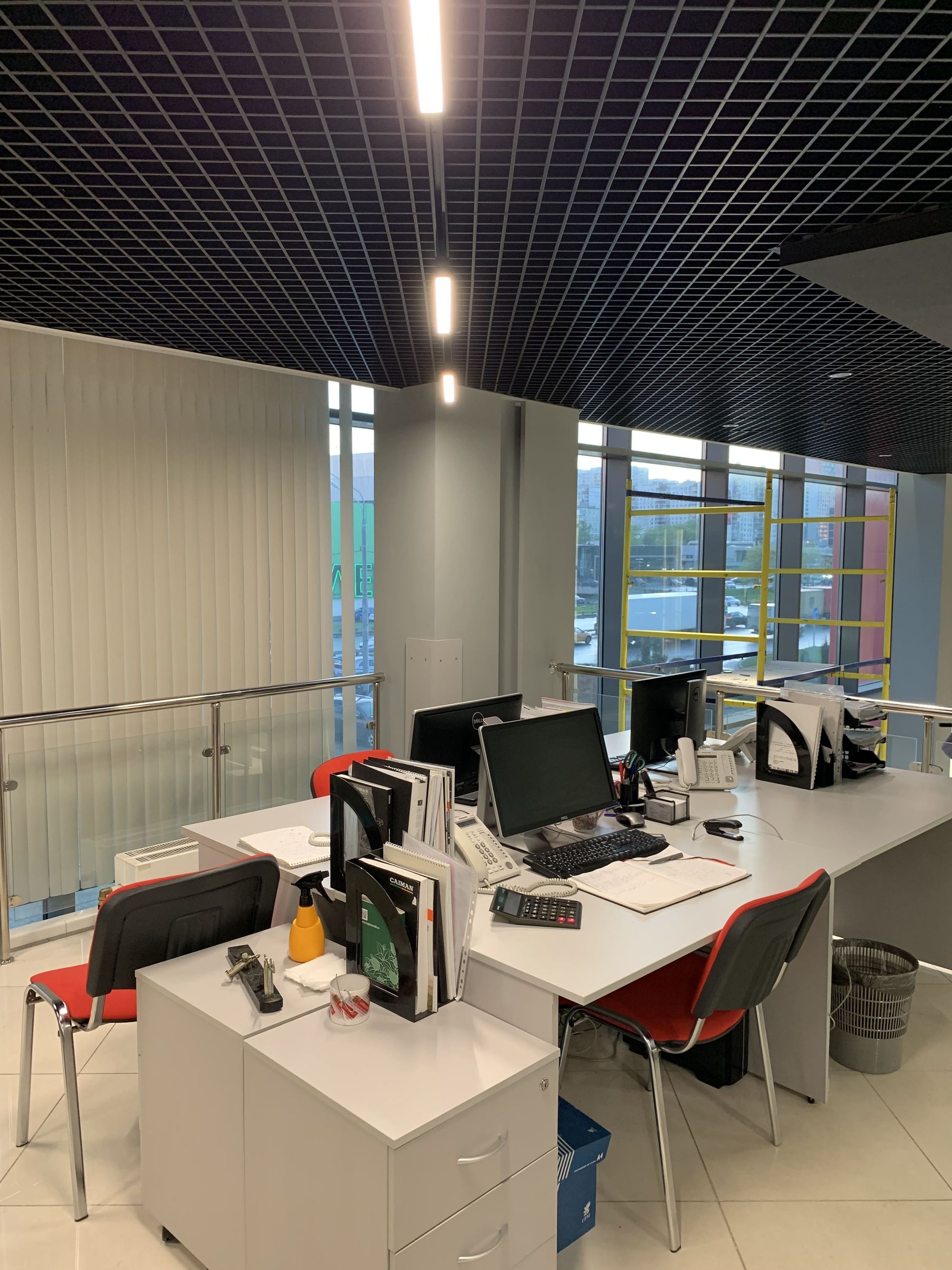 Зоны с потолками высотой до 3.5 м, в которых находятся офисы и часть выставочного зала, освещаются трековыми линейными светильниками. За счет широкого угла излучения создается яркий свет, полностью освещающий пространство.