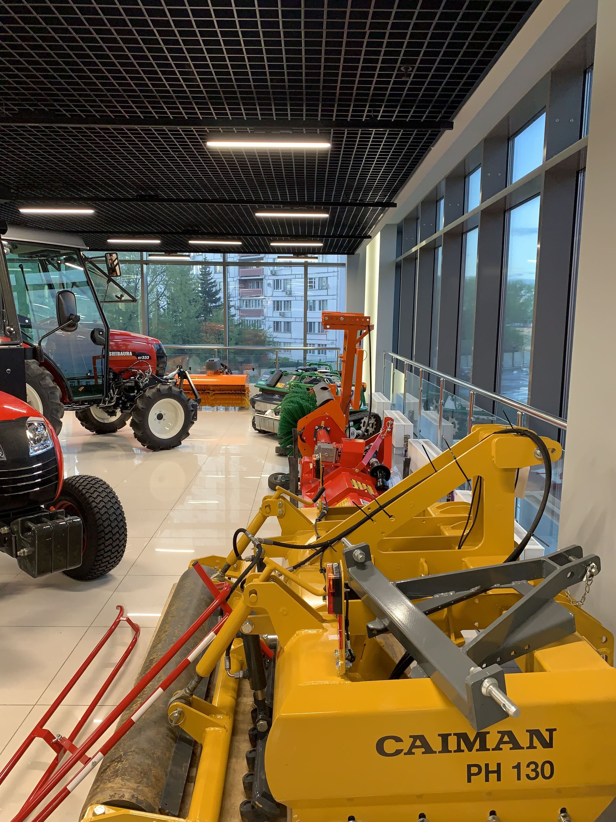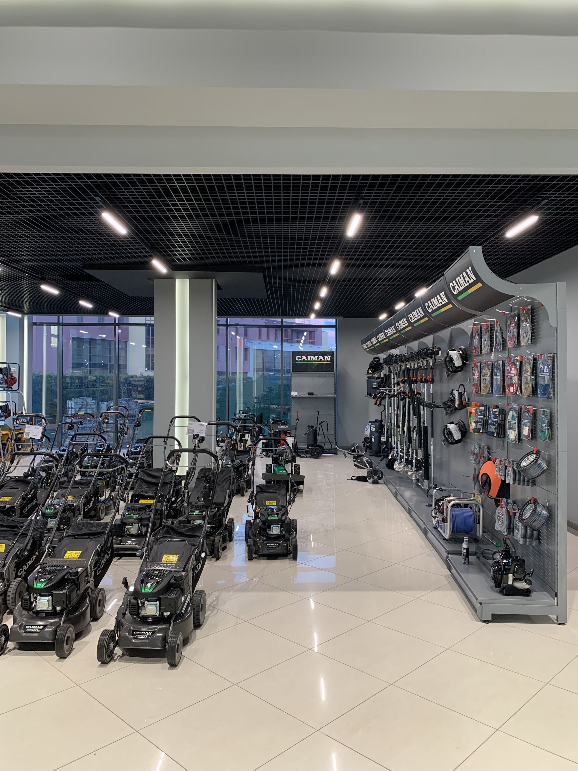 Сегодня на месте «Армстронга» — черный матовый потолок «Грильято». На его фоне линии трековых систем смотрятся стильно, подчеркивая техническую направленность шоурума. В выставочном зале с высокими потолками применяется комбинированное освещение: трековые светильники цилиндрической формы для расстановки световых акцентов и компактные встраиваемые даунлайты на потолке для основного освещения. Такое сочетание позволило создать в шоуруме гармоничный и комфортный свет для осмотра садового оборудования.