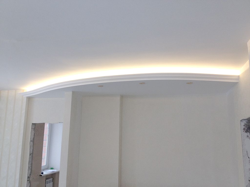 В одном из помещений была использована многоцветная RGB светодиодная лента Arlight, цвет и яркость которой можно выбирать с помощью RGB контроллера. Эта лента была установлена в декоративный карниз из полиуретана.