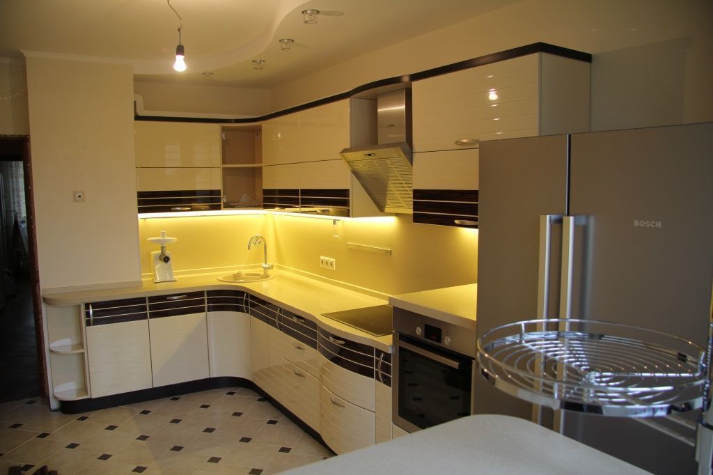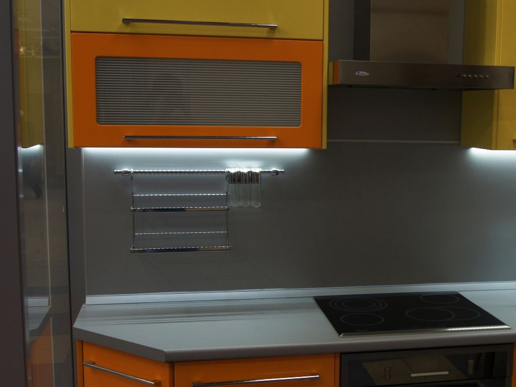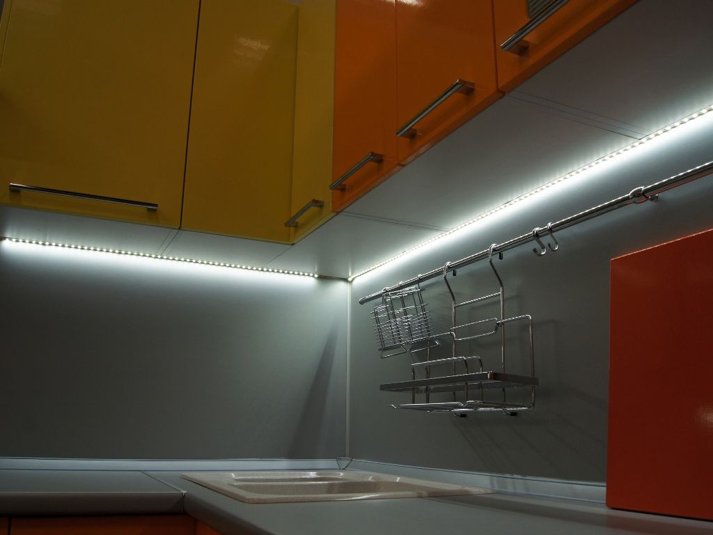 Подсветку рабочей поверхности устраивают под навесными шкафами. Существует несколько вариантов ее организации: