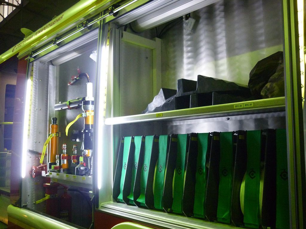 Для демонстрации пожарного автомобиля на выставке спецтехники была установлена светодиодная подсветка его отсеков.