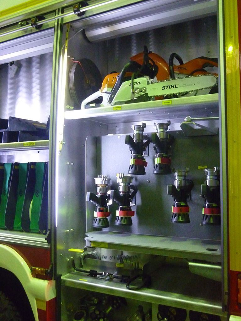 В них размещены инструменты, специальное оборудование, мостики для пожарных шлангов и сами пожарные шланги.